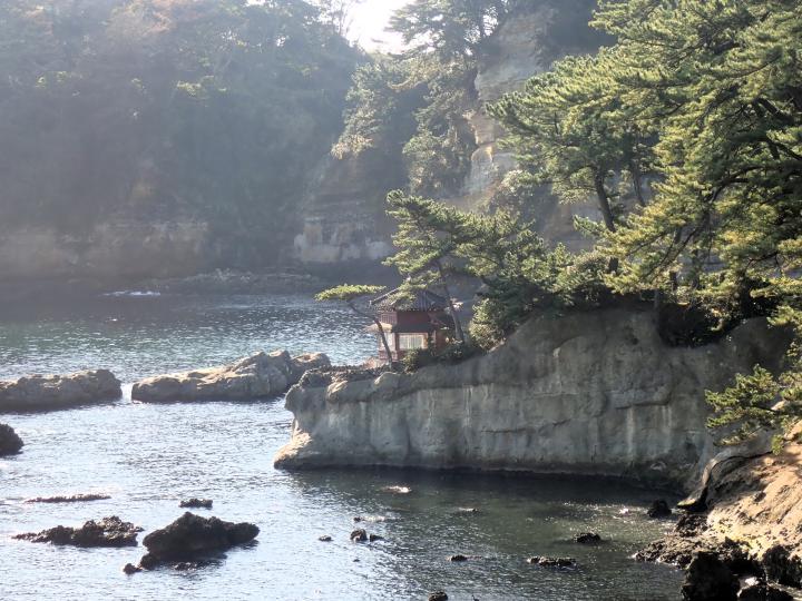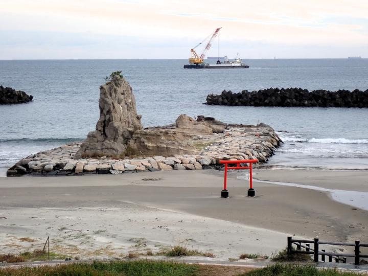 海岸には鳥居が見えます・・・