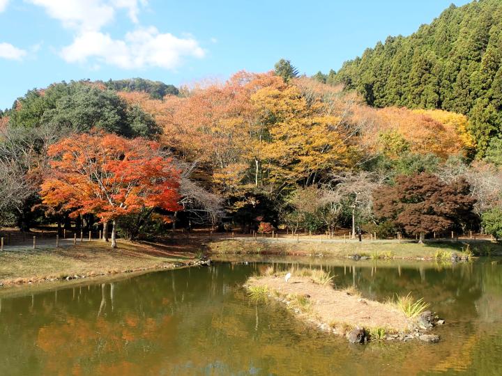 夏にハスが咲き、秋には大イチョウやモミジなどが美しく彩ります。