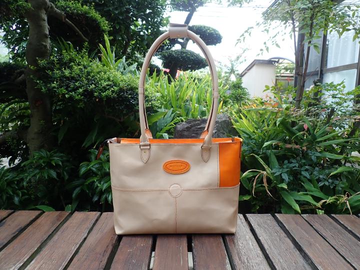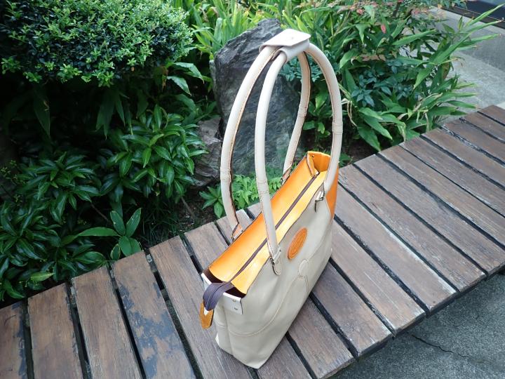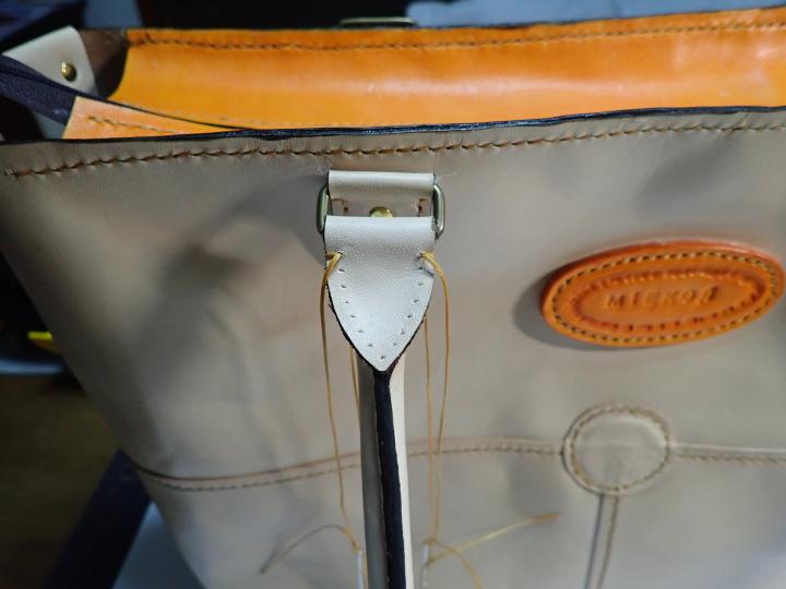 持ち手は、厚さ1.5ミリのヌメ革を使いました。