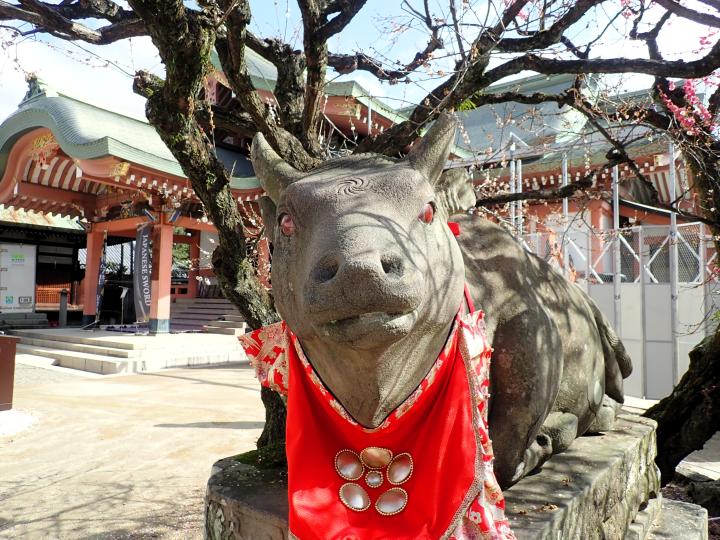 道真公は丑年生まれで、亡くなったのも丑の月丑の日だったそうで、牛の像があちこちにあります。